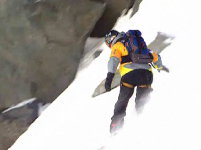 Безумный спуск на сноуборде прямо с вершины горы.